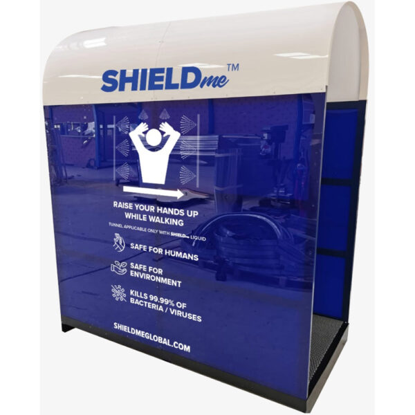 The SHIELDme Sanitisation Tunnel is a disinfecting passageway for human use, which sprays the person passing inside with a dry mist of SHIELDme high-level disinfectant and sanitiser – killing 99.99% of viruses (including COVID-19), bacteria, mould, fungi, and spores.