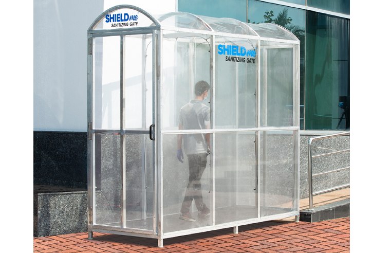 It uses the anti-bacterial sanitiser SHIELDme, which is entirely safe for human use, to spray the person passing through the tunnel with a very fine, odourless mist, activated by a pressure pad on the floor. This ensures that all skin, hair, clothing and belongings of tunnel users are infection free before entering a building or communal area.